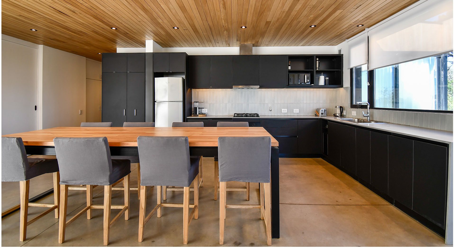 En este proyecto intervenimos distintos espacios. En cocina se trabajo con melamina mate anti-huellas con herrajes negro. Y en placares se optó por melaminas maderadas y textiles. En ambos casos dialogan con los materiales estructurales seleccionados por el estudio.