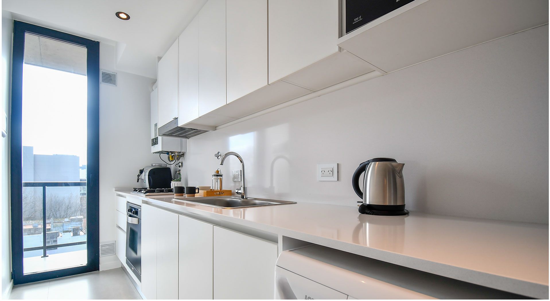 El diseño de la cocina total white en este departamento destaca por su elegancia y versatilidad, mientras que su configuración lineal contribuye a la optimización de las tareas. La paleta acromática genera mayor amplitud visual, en especial en espacios reducidos. Para acentuar la volumetría planteada, se usaron perfiles ocultos en color blanco.